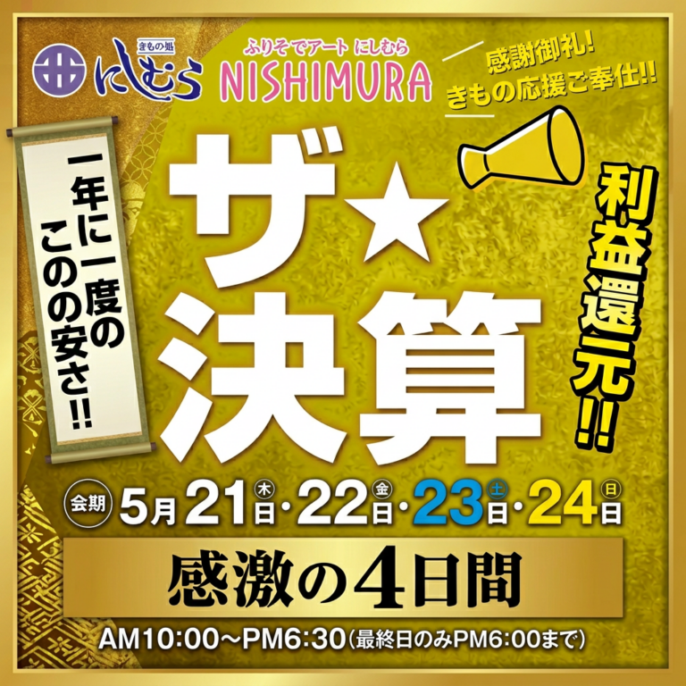 5月21日(木)〜24日(日)、きもの処にしむら全館にて「ザ★決算」を開催いたします。 営業時間は午前10時〜午後6時30分(最終日は午後6時終了)。 日頃のご愛顧に感謝して、限定プレゼントや特別フェア、プロによる相談コ […]